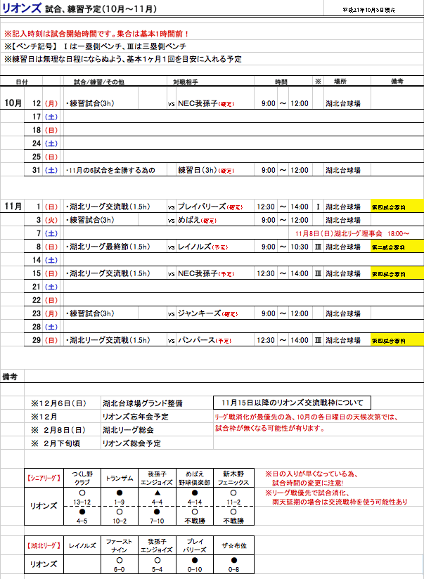 さてさて、11月上旬までの週末がすべてお天気に恵まれますと・・・ 予定表のように6試合やる事になりますんで。シーズン終了までの1ヶ月、メンバーの皆さん頑張って参加して下さいませ。